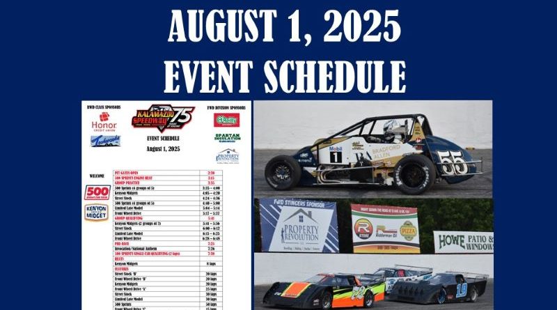 It’s a packed night of racing: the 500 Sprint Car Tour, Kenyon Midgets, Limited Late Models, Street Stock AND the Front Wheel Drives! We will see you at Kalamazoo Speedway on August 1! Event Schedule 08-01-2025 AF2