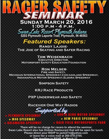 The Swan Lake Resort in Plymouth, Indiana will host a Racer Safety Seminar on Sunday, March 20 from 1:00-4:00pm. Featured speakers include two-time NASCAR Xfinity Series Champion Randy Lajoie, who is also the owner of The Joie of Seating. There will be no charge for racers to attend the seminar. All the details on the seminar can be found on the flyer associated with this post.