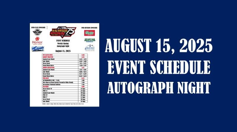 The Event Schedule for August 15, 2025 is here. All four weekly classes race plus it’s Autograph Night. SPECIAL: 8-person skyboxes $200; 16-person $400. Event Schedule 08-15-2025 (Weekly Racing-Autograph Night)